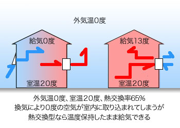 熱交換機能がなければ、20度の室温を排出して、0度の新鮮空気が流入します。