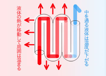 管の内側を熱い液体が通って周辺の空気を温めますが、これは液体の熱が空気に伝わって起こる現象です。
