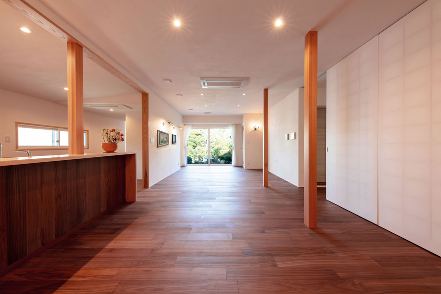 視線を奥へ外へと誘導することで、水平方向の吹き抜け効果が得られます。