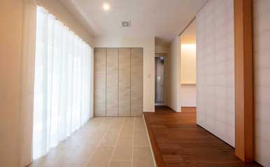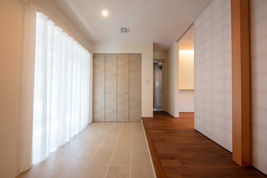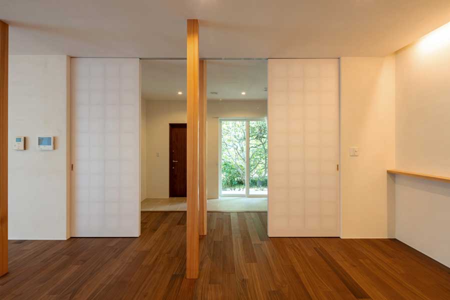 キッチンの向こうの窓から注ぐ光が届き、障子を閉めても開けても、明るい玄関です。