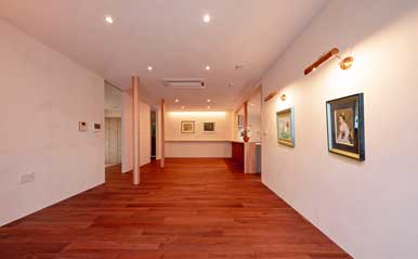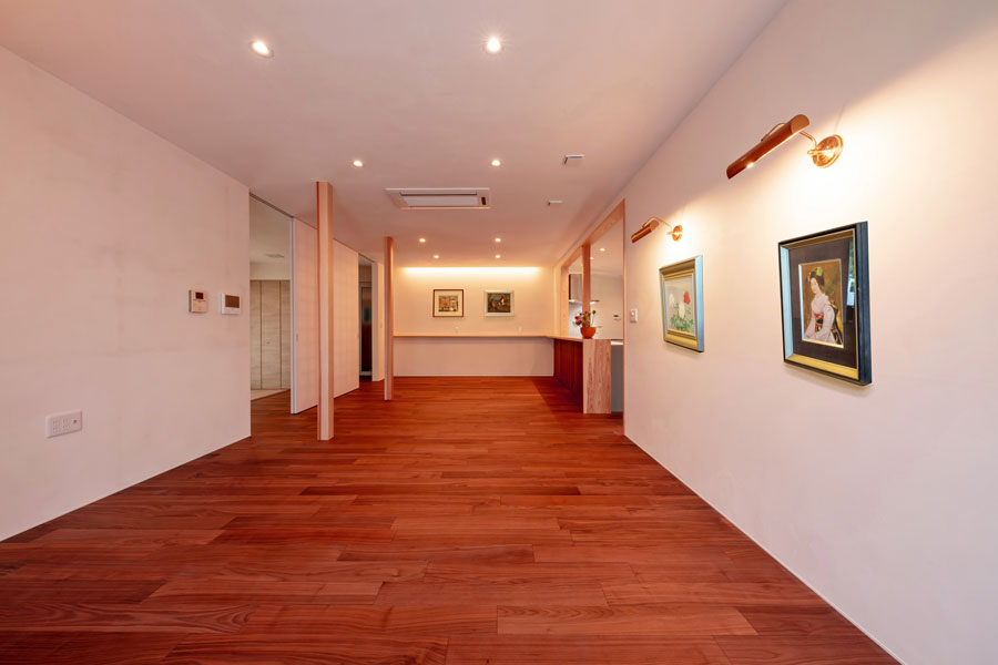 建築主の絵画コレクションを楽しめるよう壁面を強化し、エアコンや換気扇・照明器具は天井に設置。