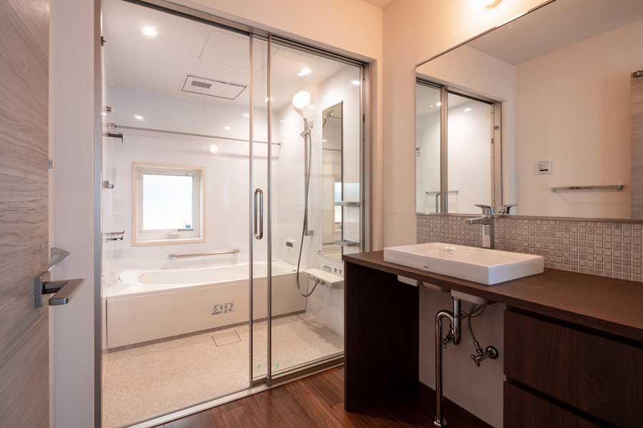 ガラス引き戸のユニットバスは洗面脱衣室を光で満たし、空間全体を広々と明るく見せます。