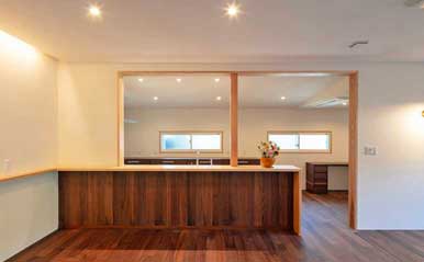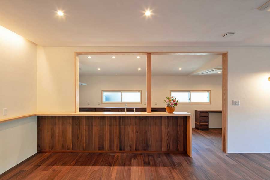 ダイニングスペースの向こうのキッチンは、食卓からは手元が見えません。