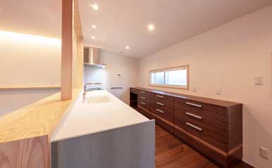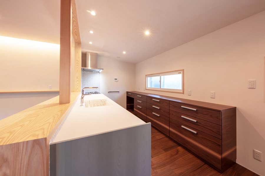 キッチンの背面には、同じ高さで同じ長さの大きなカップボードを造作しました。