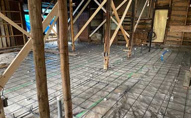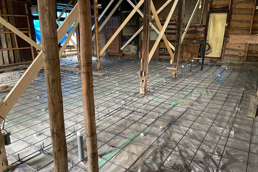 そこで鉄筋を組みコンクリートを打設して基礎底部と布基礎を作り、建物を支持できる基礎を形成しました。
