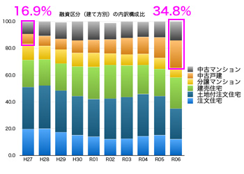 同じ時期、新築注文住宅と土地付き注文住宅の割合は、合計51%から34.9%へ、分譲マンションも11.9%から7.2%へ、いずれも大きく縮小しました。