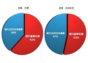 総務省「住宅・土地統計」によると、持ち家の既存住宅で2000年基準を満たすのは約4割、半数以上の木造住宅は必要な水準を満たしません(グラフ1)。