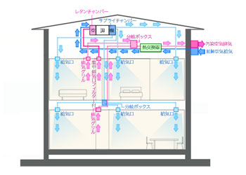ここでいう全館空調とは、温度調整済みの新鮮空気をダクトで屋内の各部屋に届け、室内の汚染空気は排気ダクトで熱交換器に回収し、熱を取り出したあとで屋外に排出する、一連のシステムを指します。